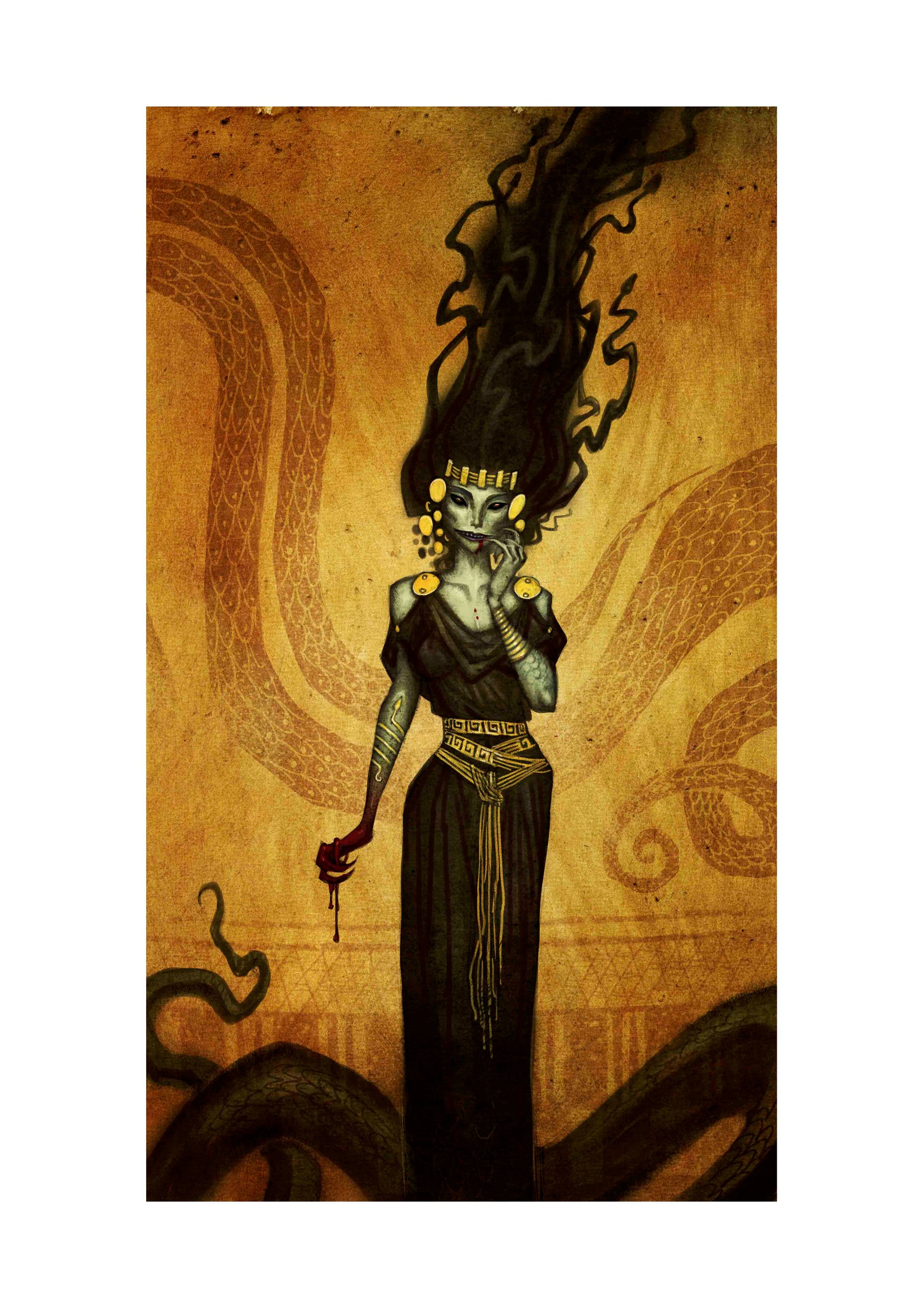 Lamia is a demonic vampire originating from Greek myth. According to the legend she was once a stunningly beautiful Libyan queen who had the misfortune of becoming one of the many lovers of the notoriously unfaithful Zeus. The sky god’s wife Hera was prone to jealousy and exacted a dreadful revenge every time her husband strayed. Zeus hid Lamia in a cave to keep her from falling into his wife’s clutches, but cunning Hera found her eventually. The stories vary from this point, but all versions agree that it is far from a happy ending...