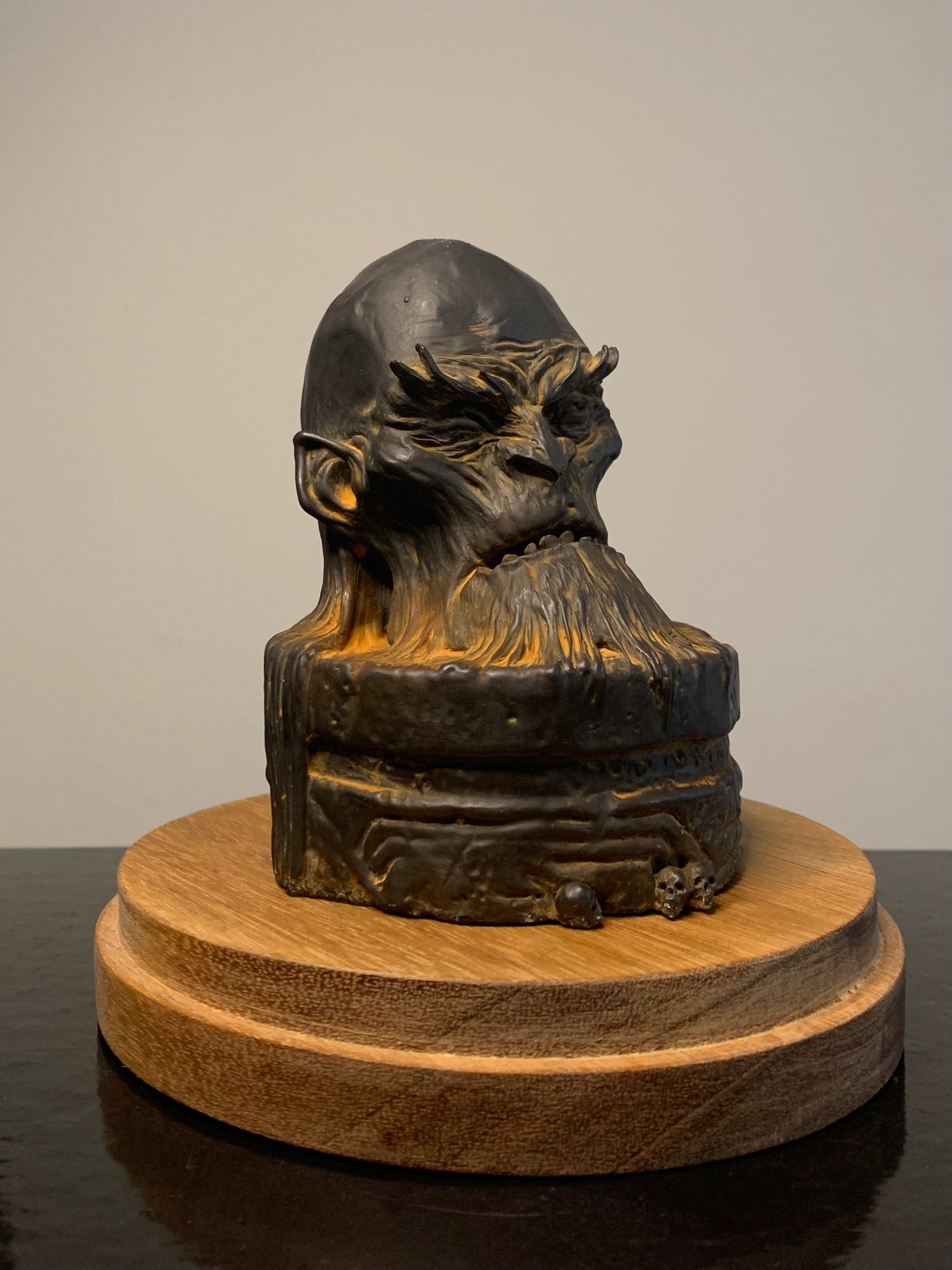 The Mimir statuettes comes in two variants - the first is cast in green grey resin and comes unpainted, the second is cast in black resin with iron powder mixed into the material which lends the statuette a rusted finish.