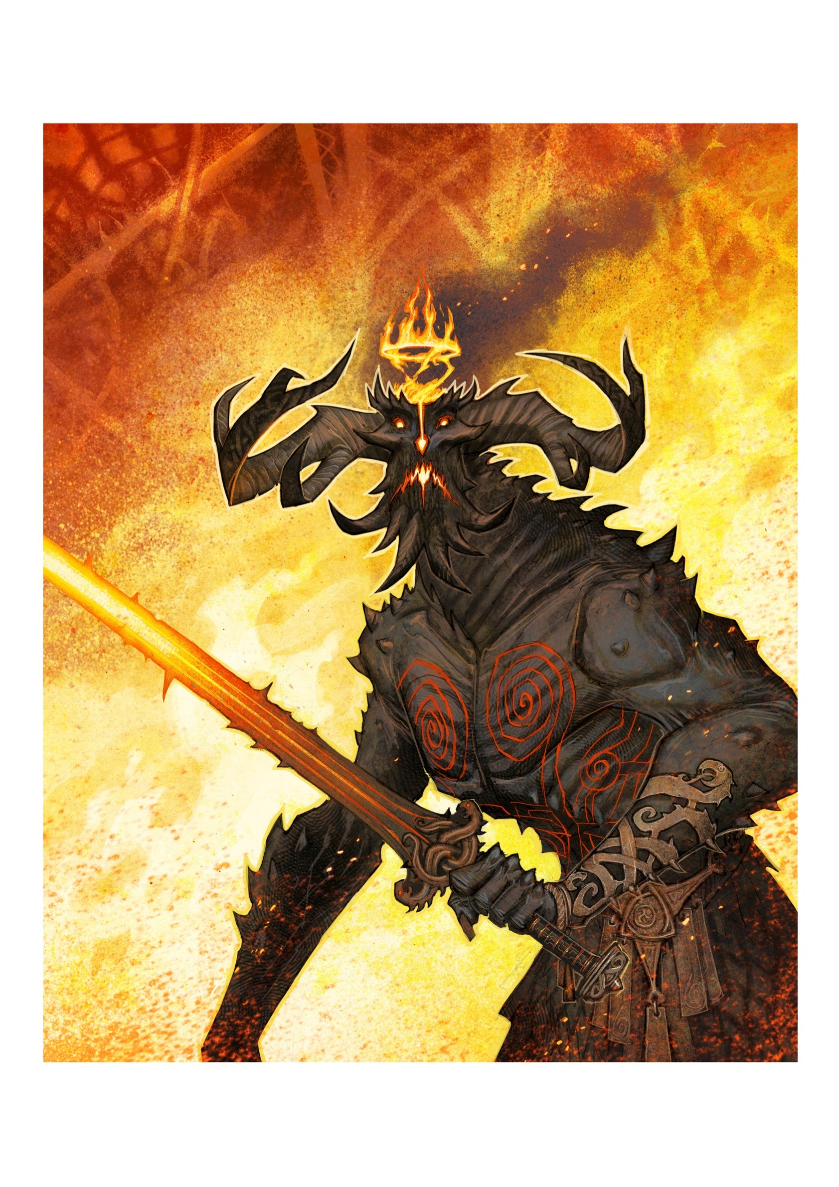 Surt is the ruler of the demonic fire giants and has total supremacy over the land of fire, Muspelheim. His name means “the black one”. Surt stands guard at the border to his realm and slays any potential invaders. He is as ancient as Muspelheim itself, and rose out of the fiery flames at the beginning of time, long before the rest of the cosmos had been created.